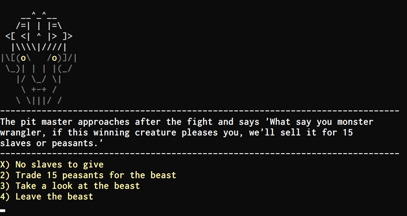 * Added Baiaa Pit Master will offer to sell you the winning monster of any pit fight for 15 slaves or peasants if you have any free slots in your monster pit * Fixed sound not resetting after monster fight in Baiaa * Added 2 new questions to Baiaa monster pit master 'What do you do with the slaves or peasants you take for entry' and 'Who watches these fights?' * Fixed slave and peasant availability indicators for Baiaa pit fight show as available even when you don't have the peasants or slaves * Added new indicator on Baiaa monster fight entry of if you have no slaves/peasants or not enough * Fixed 2 text bugs with Baiaa slave fight entry costs