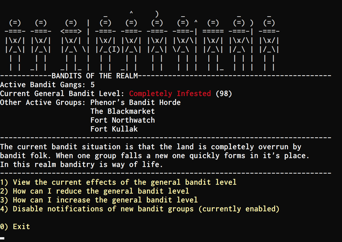 I playtested setting the bandit level near it's max of 100 which is 'completely infested', from here I set out to completely wipe out the bandit population and reduce the bandit level to 0.