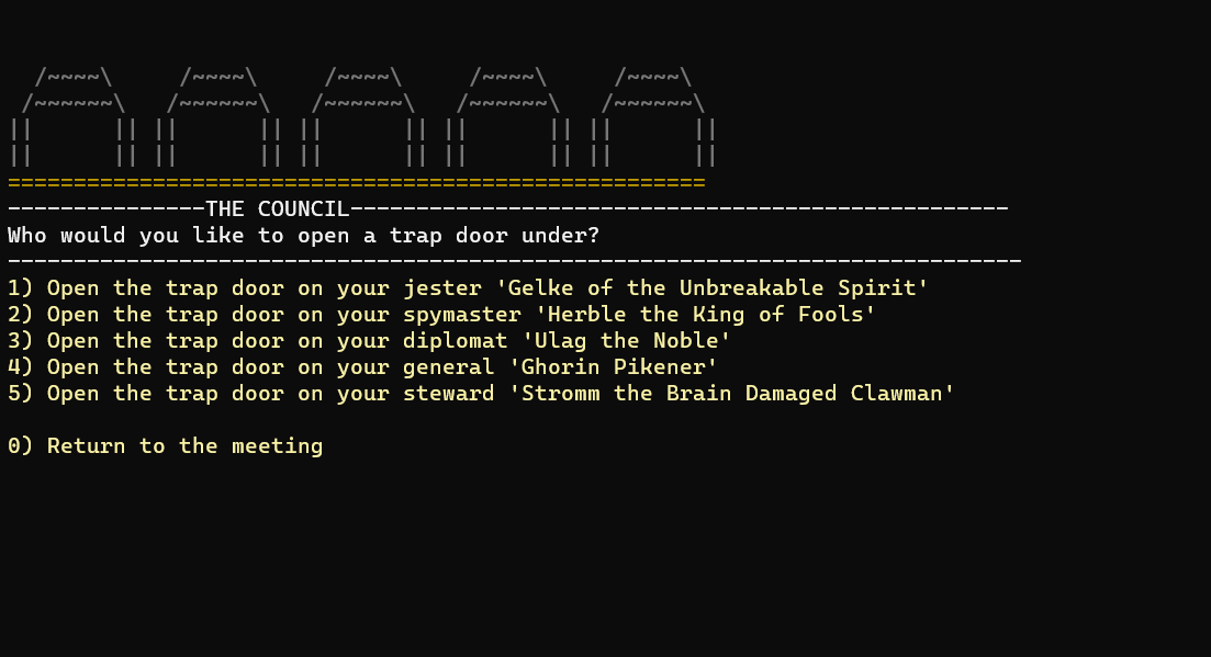 * Can now throw your staff through a trap door at staff meetings * Fixed 9 bugs * Merc groups get 25% stronger with each set of new lands discovered * Some tweaks to the stuff from last update to run smoother * New goblin sceptre event system with a few events * You can now call the guards when you find those pickpocket kids in the Blackmarket and get a sweet bounty! (2 gold per kid)