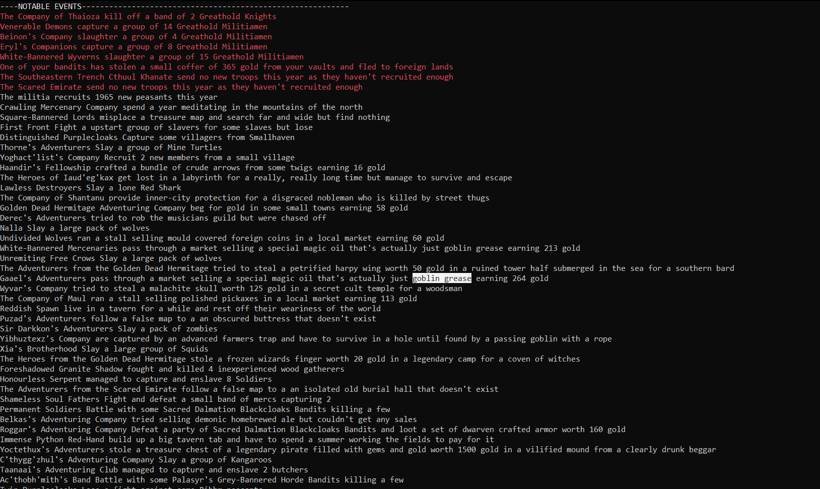* 10 more end of turn events * Ultimate victory screen for 25k land empires * Merc groups now recruit troops each year * Added goblin jesters in the throne room with 25 jokes told in goblin style * Added 9 new jokes jesters can tell about goblins * Improved Elyk the Madmans reactions to stuff when drinking with him * Added ability to send a massive warband to attack adventurers * Added ability to sit and ponder on your throne when no one is visiting * Fixed 5 bugs * Made some other small tweaks
