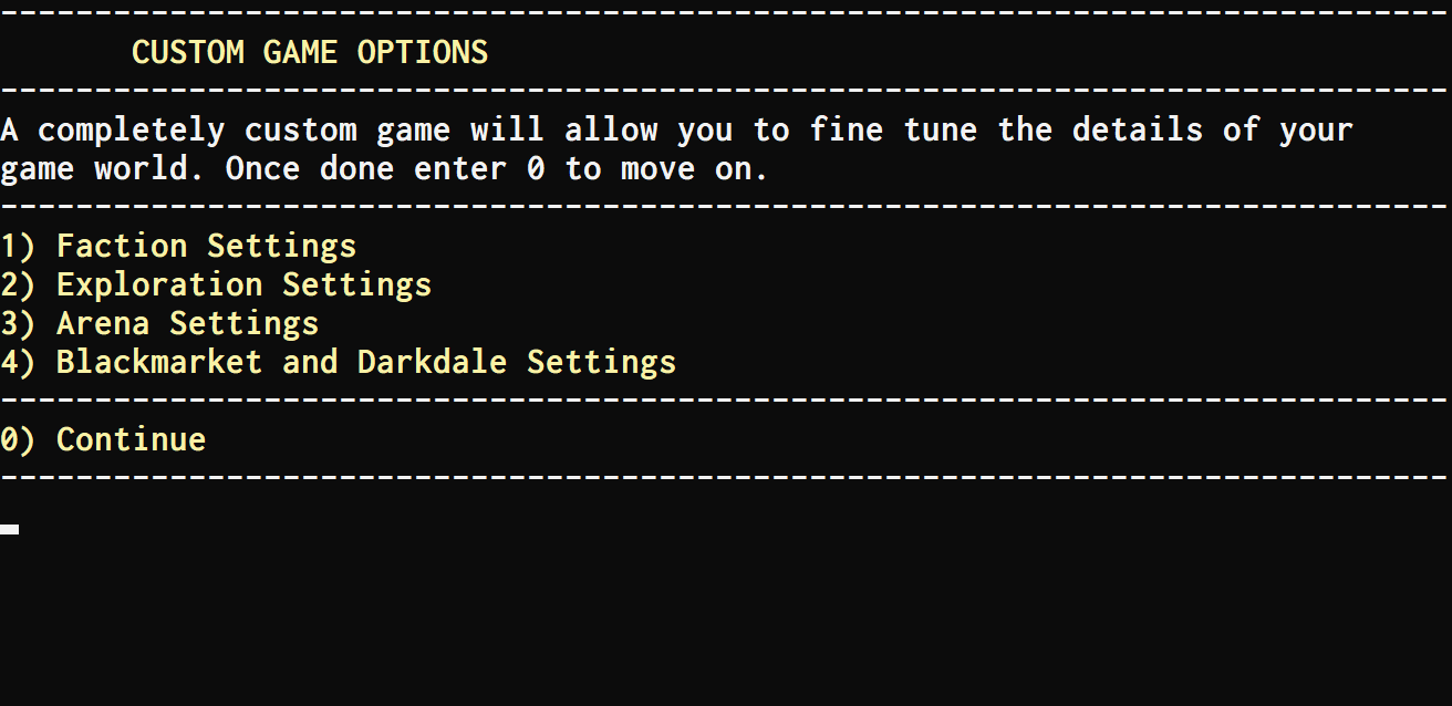 The custom game option is meant to allow players to start a game that is customised and tweaked to their liking, but in many ways this custom game system was lacking. I've reorganised it a bit and added a bunch of new features such as, the ability to tweak the arena, and to start the game owning Darkdale, Blackmarket, and the Arena. As well as lots more customisation with the bandit horde and bandit gangs.