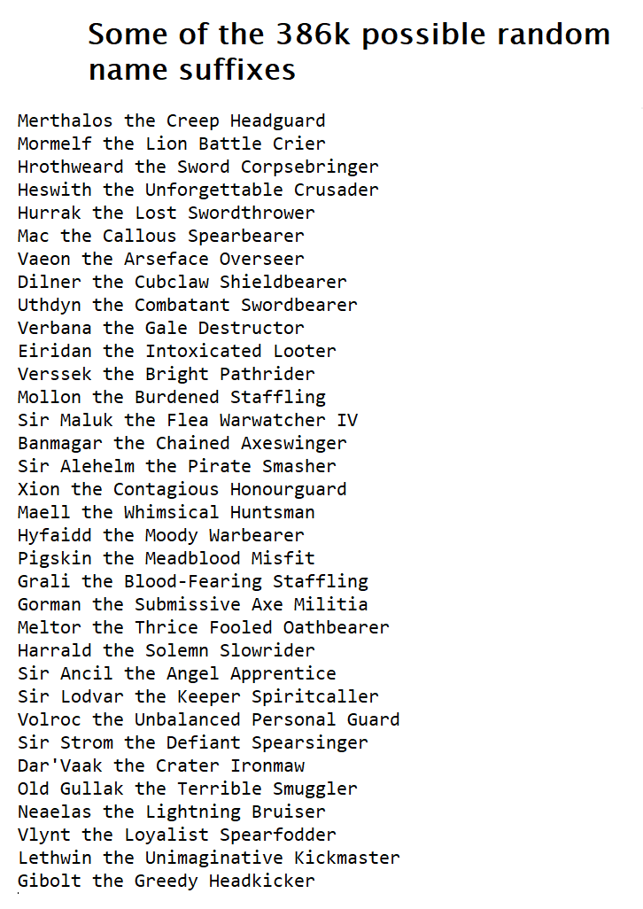 More suggestions, more possible hero titles! We had a ton of new suggestions so I've split them into two sets, one for standalone name suffixes like below, and another section for suffixes that can be further randomised to create even more possible suffixes.