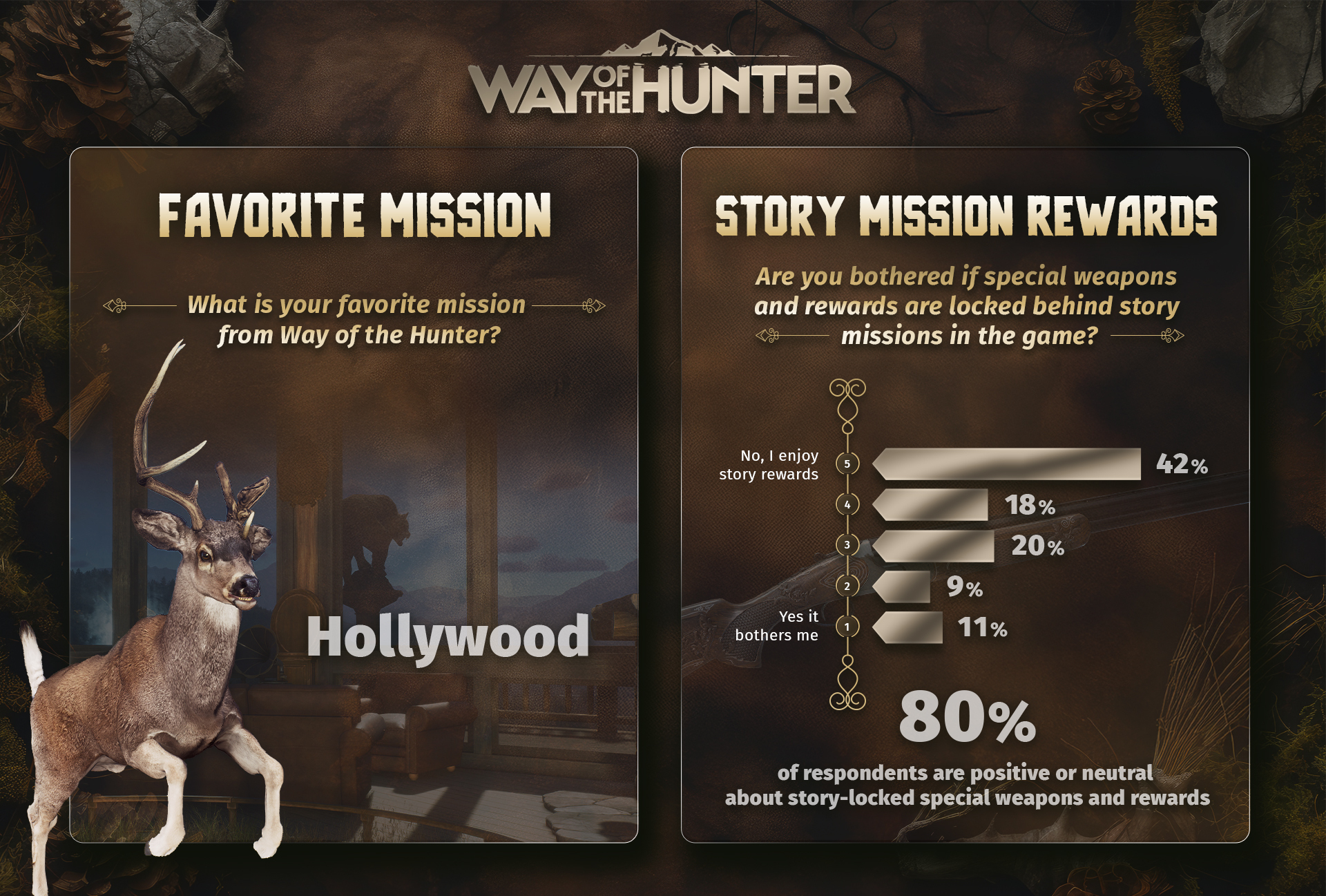 Hollywood took the spotlight as the most praised mission, loved for its emotional depth, unique trophy, and personal connection. Respondents appreciated the tradition and the challenge of hunting the legendary deer with diverse antlers right at the start. As for story mission rewards, most respondents enjoy the thrill of unlocking special weapons and rewards - what a nice surprise! We’re thrilled you’re enjoying those sweet rewards.