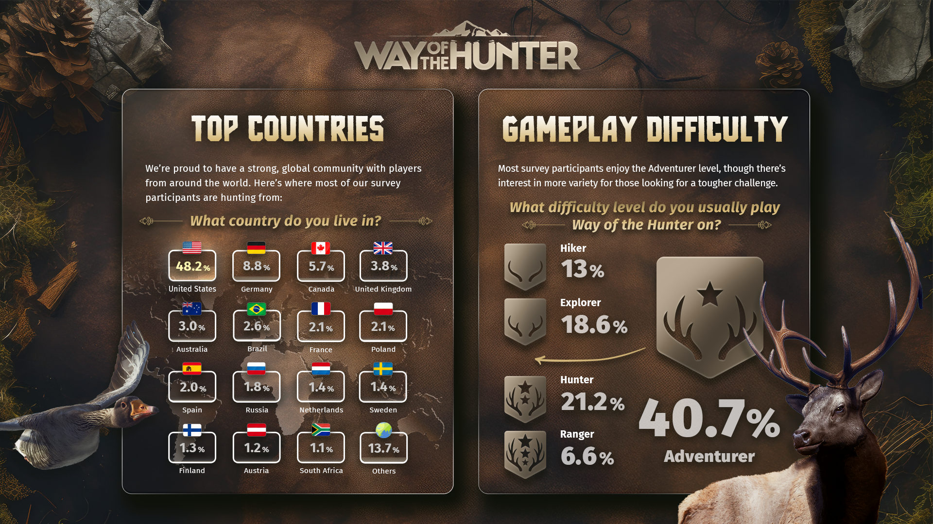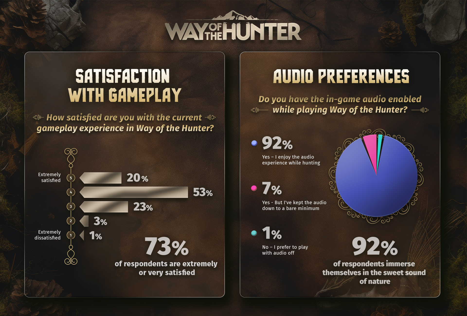 73% of players are either extremely or very satisfied with the current gameplay! Plus, 92% of you keep in-game audio enabled, and we’re dedicated to enhancing our sound design for an even more immersive hunting experience.