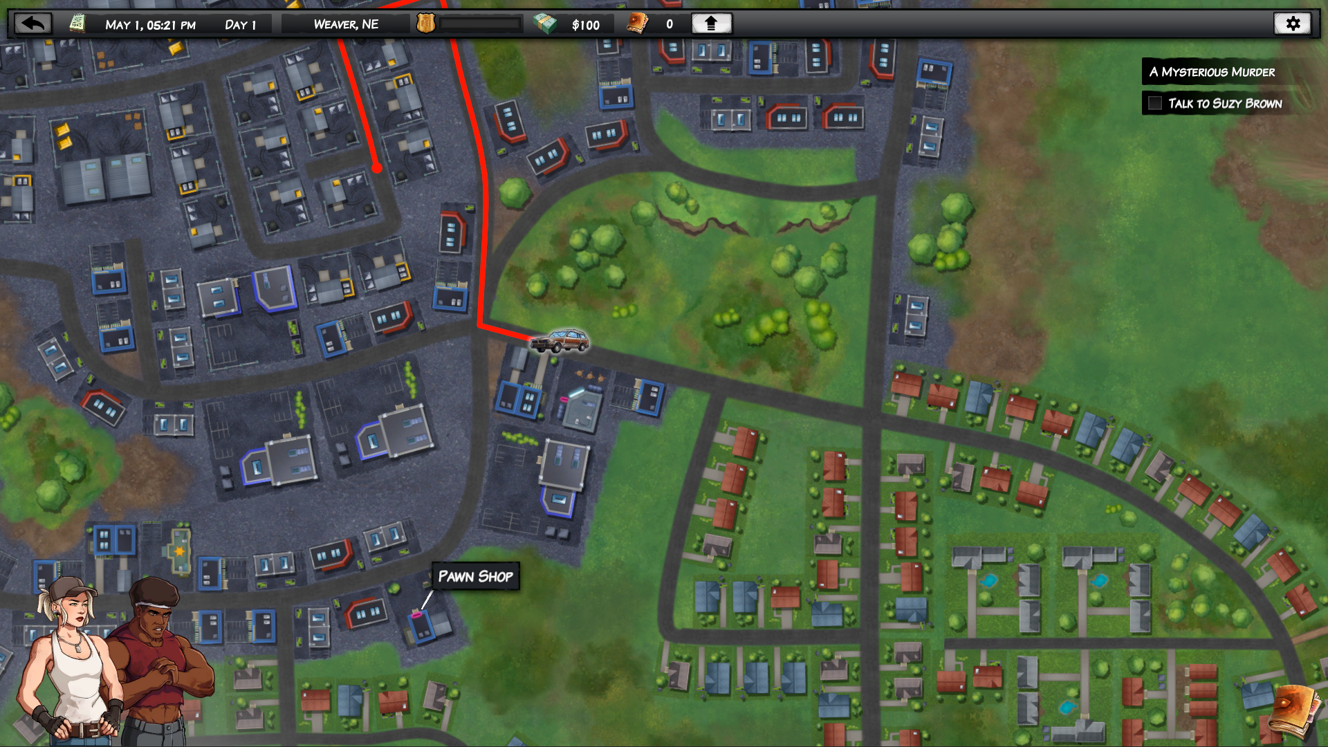 In addition to locations which are relevant to your current case, each town always has a couple of basic buildings, such as a motel for you to rest and heal or a pawn shop to buy and sell equipment. And you can always hover over a building to get more information before driving to it.