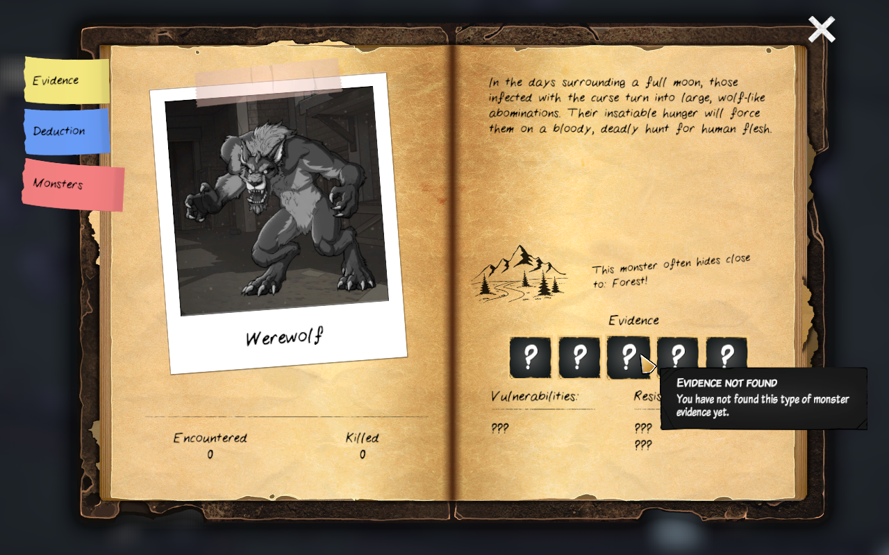 Your most important tool for solving a case is your journal. This is where you keep all the clues and information for the monsters that you found. Check out the work-in-progress screenshot of the hunter journal.
