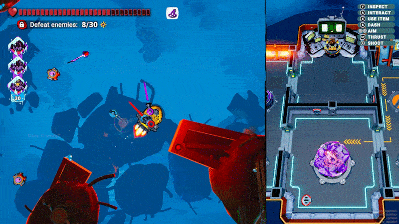 - Added a cooldown indicator for chargeable modules such as the BF-S-G and the new Black Hole Turret - Added a cooling mechanic to overheating modules such as the Gatling Gun. Spraying those turrets with a Fire Extinguisher or the new Exting-Squish item will cause them to overheat slower and cool down faster - Added visualization for the item throwing mechanic - Fixed Infested Swamps strains often spawning inside of walls - Fixed an issue where Dusty would get stuck while cleaning - Fixed a bug where locked chests would spawn underneath quests - Fixed an issue where pickups could not be collected but were instead rotating around the ship - Fixed a bug where stealing from the shop would not trigger a warning message by Ceasar - Fixed a bug where unlocked module variants would not display in the upgrade panel anymore - Improved localizations - Minor balancing changes
