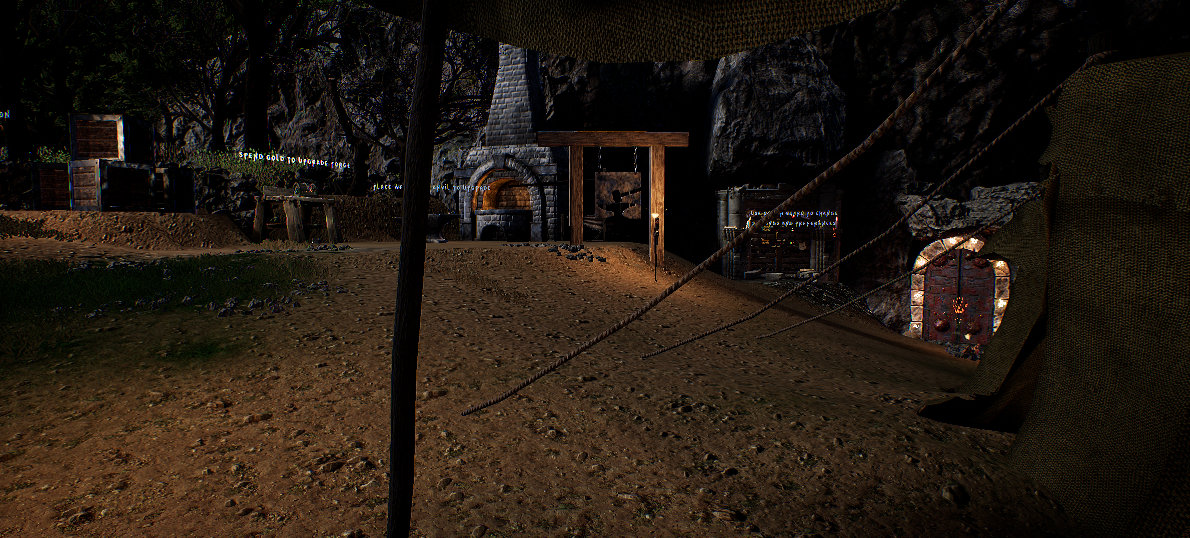 Beside the waterfall, you’ll find the dungeon door, which has been revamped and moved to the end of The Camp. In addition, the settings board has been moved to beside the dungeon door so that players can make changes before going into the dungeon. The settings board allows you to change your movement method, your dominant hand, and how you want to drop items.
