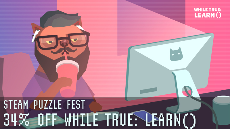 If you made it here, you probably know already that there's a Steam Puzzle Fest happening right now! From April 24 at 10:00 AM PDT (UTC-7) to May 1 at 10:00 AM PDT (UTC-7) you have a chance to grab while True: learn() with 34% off the price. As usual, all DLCs are 14% off, too!