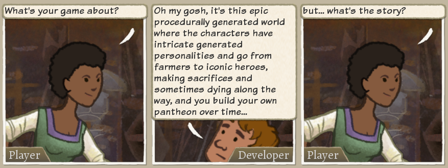 At first we had this vague sense that you were sortof "settling" the land, making it safe from monsters, that sort of thing. And once we went down the procedural heroes and fights path, we didn't want to marry ourselves to a particular overall storyline either. Here's why.