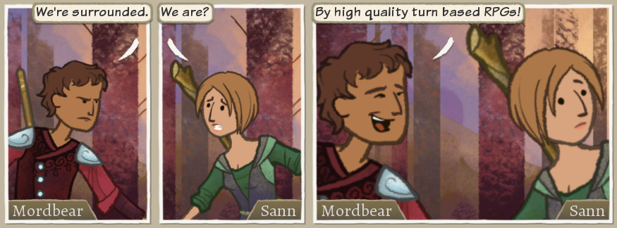 So we abandoned that route and starting writing events that could be triggered randomly, when the heroes arrive at a hostile site, for example. (This is pretty much the approach that FTL uses, along with having a very thing overarching plot.) That's where we've been focusing our efforts over the last couple years, and it's paid off. So now we have a game that we can play over and over again, which is pretty great.