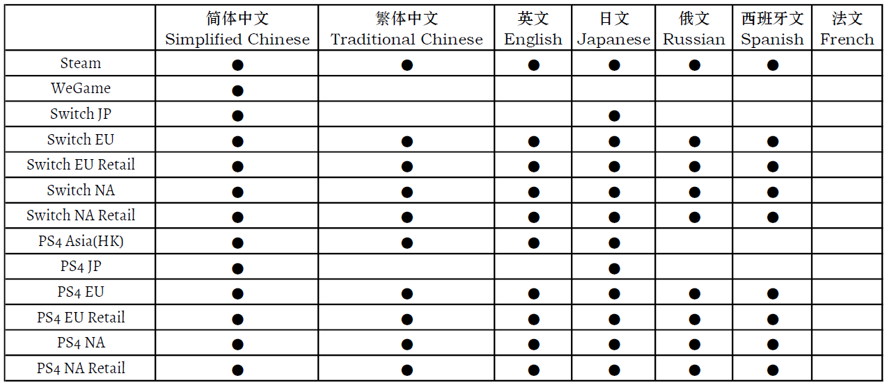As the different versions of WILL increase, sometimes I can't remember which versions support which languages. Recently, the PS4 EU version will be released soon. I sort out a list of language support for each version: