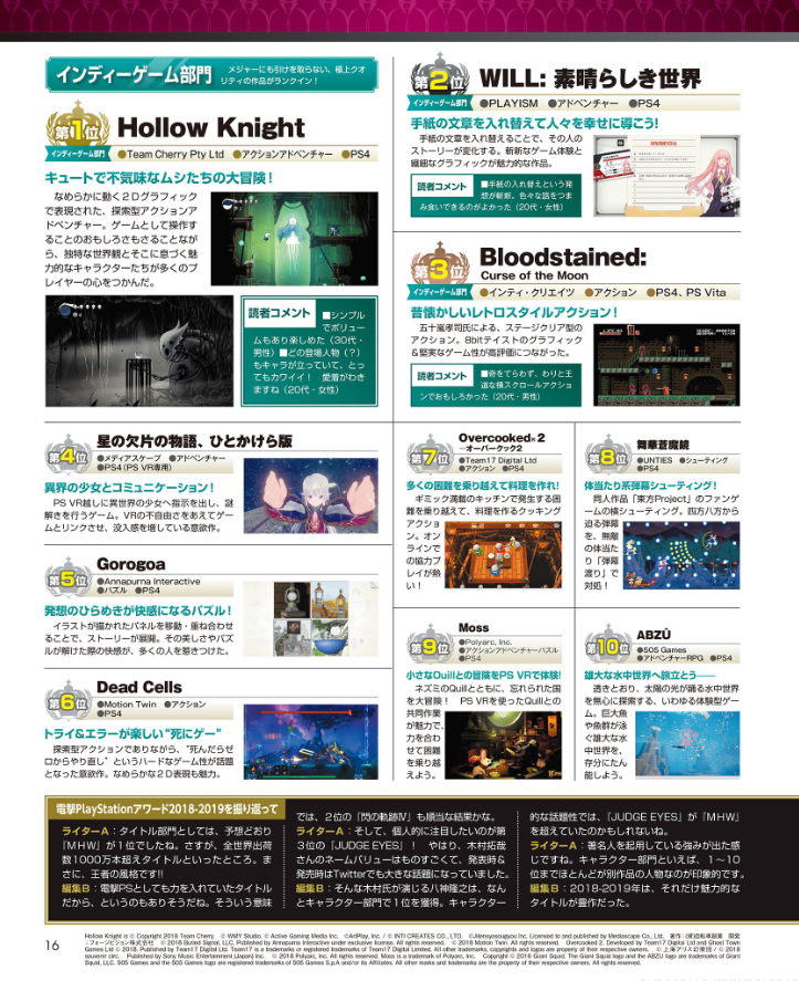 WILL: A Wonderful World won the second place in the Dengeki PlayStation 2018-2019 Award! Thank you for your support!