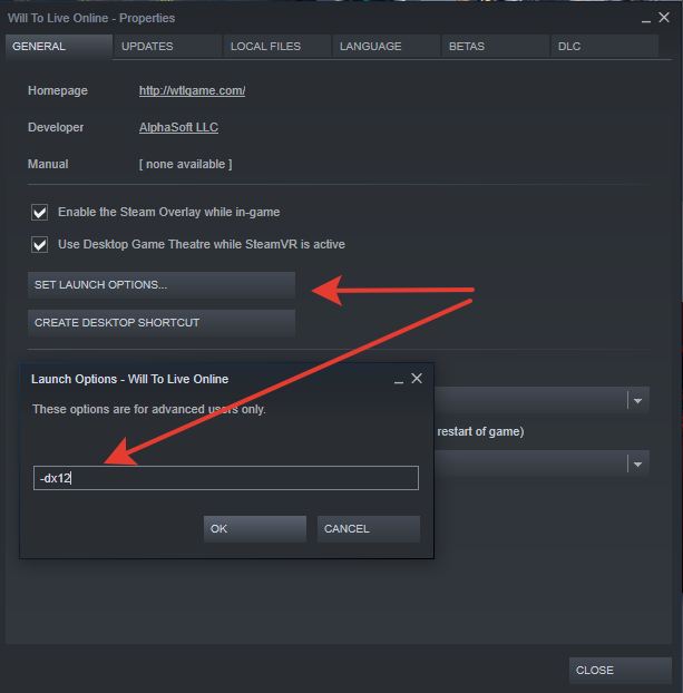 However, thanks to this, experimental support for DirectX 12 appeared in our game. To run the game in the DX12 mode, you should configure Steam as on the screenshot below.