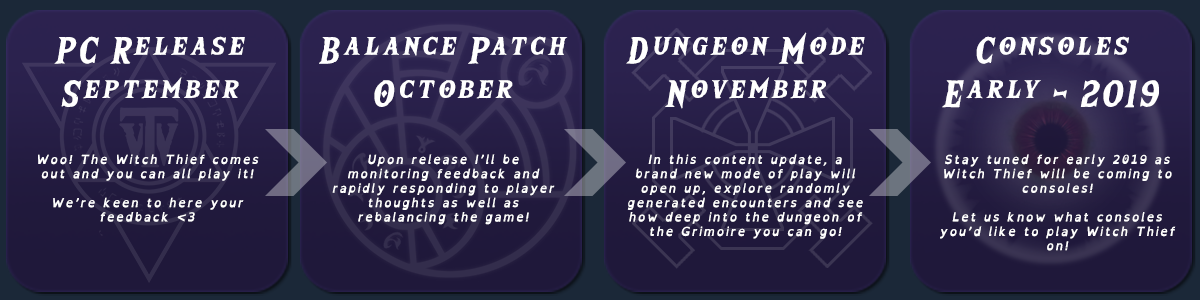 G'day friends, on the road to release, I thought it would be a good idea to draw up a roadmap for Witch Thief and the future of it. This way you will know what to expect with the future of Witch Thief as well as look forward to some new content down the line :D