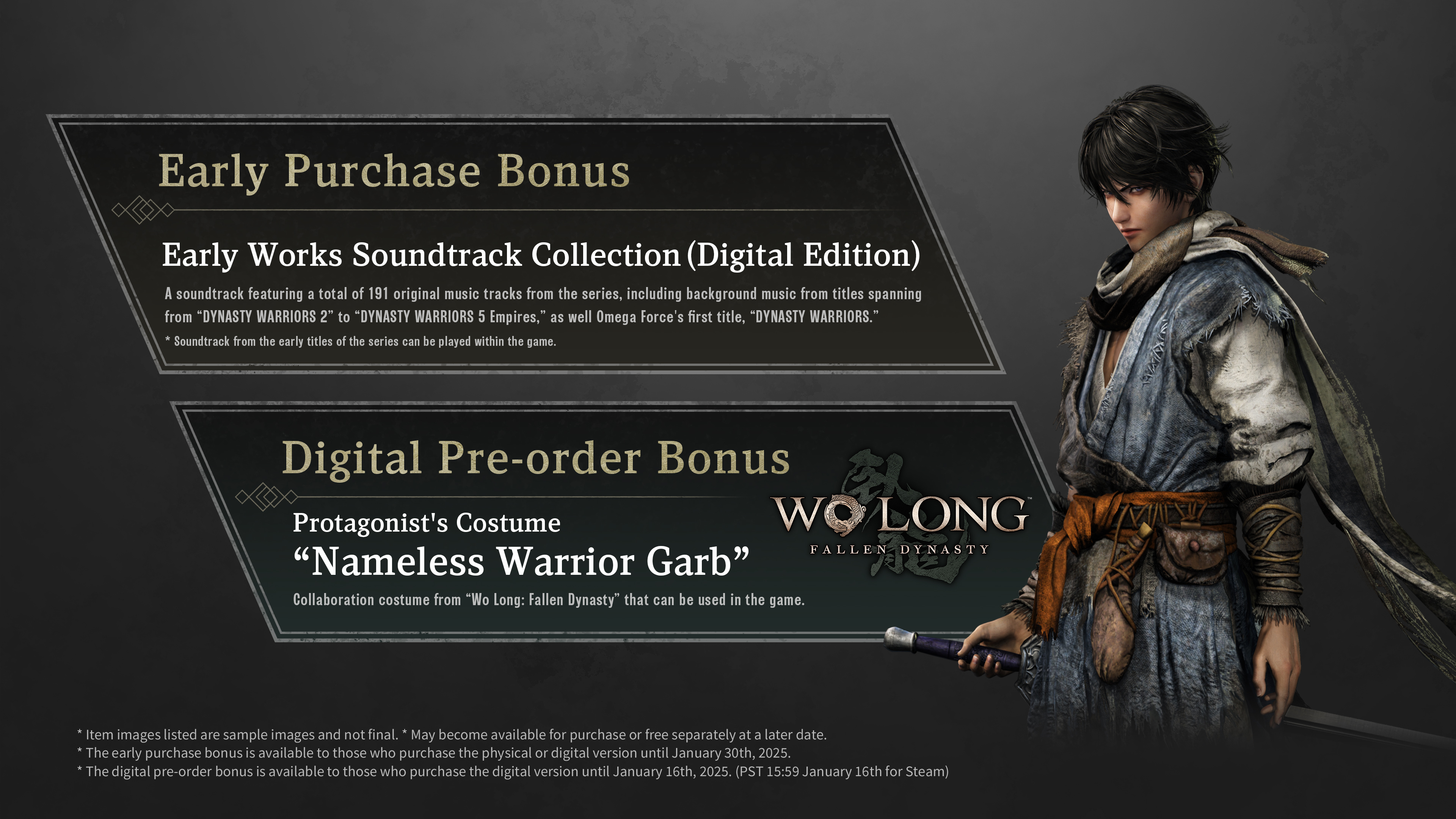 "Nameless Warrior Garb," Wo Long's protagonist's costume, is also available as the digital pre-order bonus for DYNASTY WARRIORS: ORIGINS đ Don't miss out on this opportunity to enjoy Wo Long in the world of DYNASTY WARRIORS by 23:59 on Thurs., Jan. 16! [p][/p] https://store.steampowered.com/app/2384580/