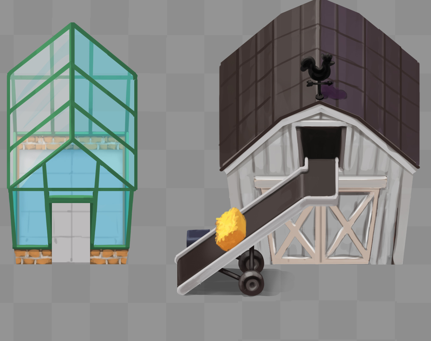 This delay should not affect the planned updates I discussed a few weeks ago. I hired videogame artist Daniel Thomas for another 10 weeks and he started working on the new buildings. Here’s a preview of the barn and the greenhouse: