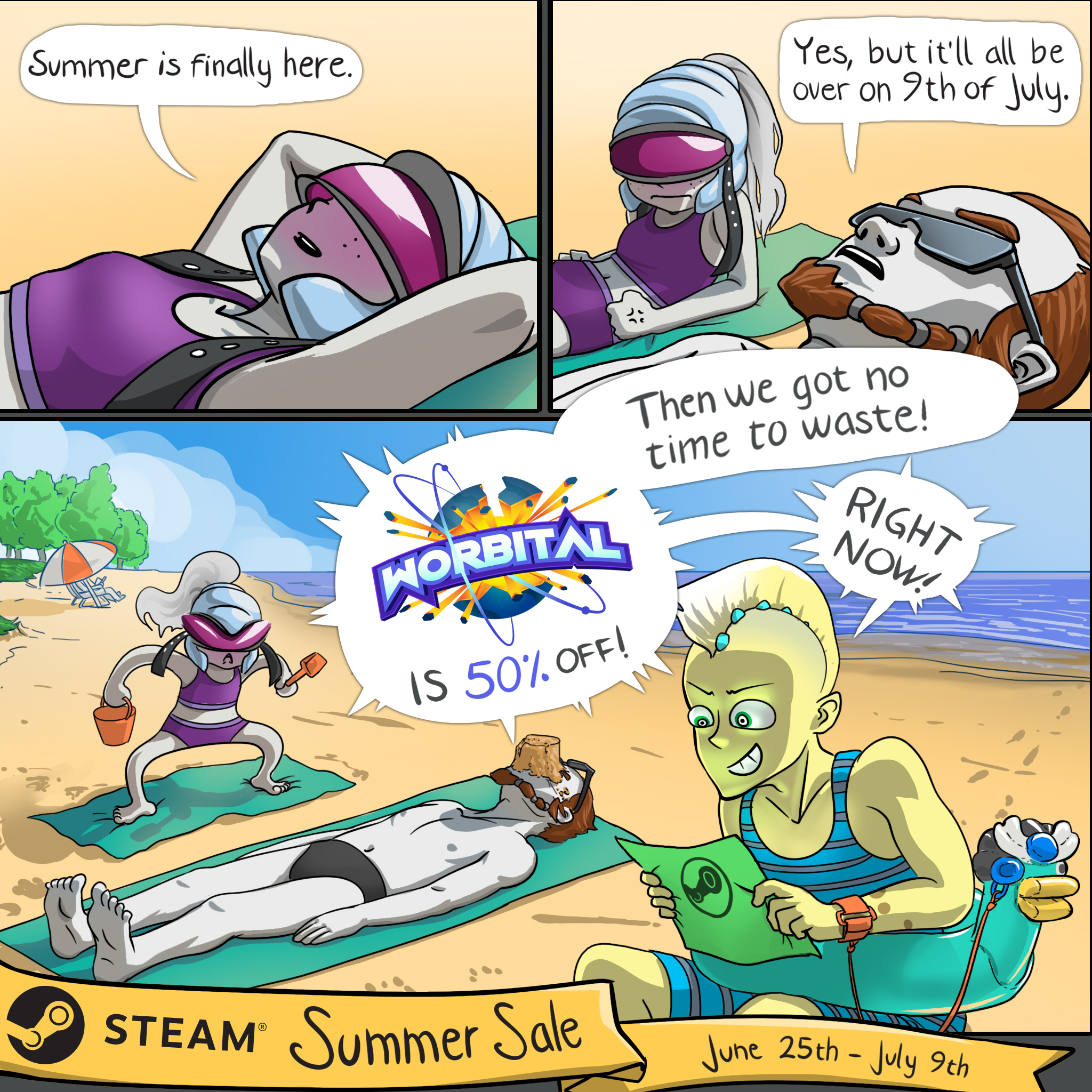 Citizens! The time has come for the annual Steam Summer Sale. If you’ve been holding off on getting Worbital, to get it at a bargain price—here’s your chance. For the following two weeks, Worbital is half-price on Steam. Don’t miss out 😉