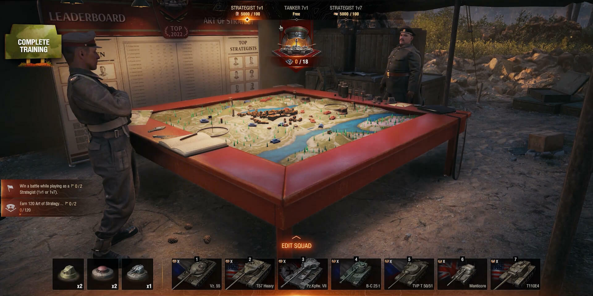 Vehicles for the Strategist's squad are selected in the event Garage. Click the squad composition button and fill all seven slots with Tier X vehicles. You will be able to select any researchable and collectible Tier X vehicles that exist in the game, with the following exceptions: