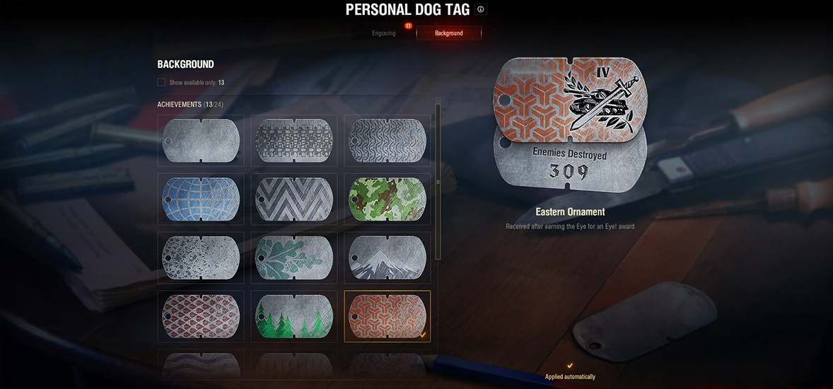 • Player and clan name: This element cannot be modified. It only changes when you choose a different player name or join another clan. If you have the Anonymizer enabled in the game settings, your opponents will see randomized information in place of your actual player name and clan name. • Background: This can be obtained by performing certain feats in battle. You can switch backgrounds via the corresponding tab on your Personal Dog Tag screen. • Engraving: This is the most important part as it displays the main information that your defeated opponents will see. The reverse side of the Dog Tag shows details about the achievement that the engraving was received for, such as the number of battles fought or your victory rate. • To unlock Engravings, you must meet certain conditions.