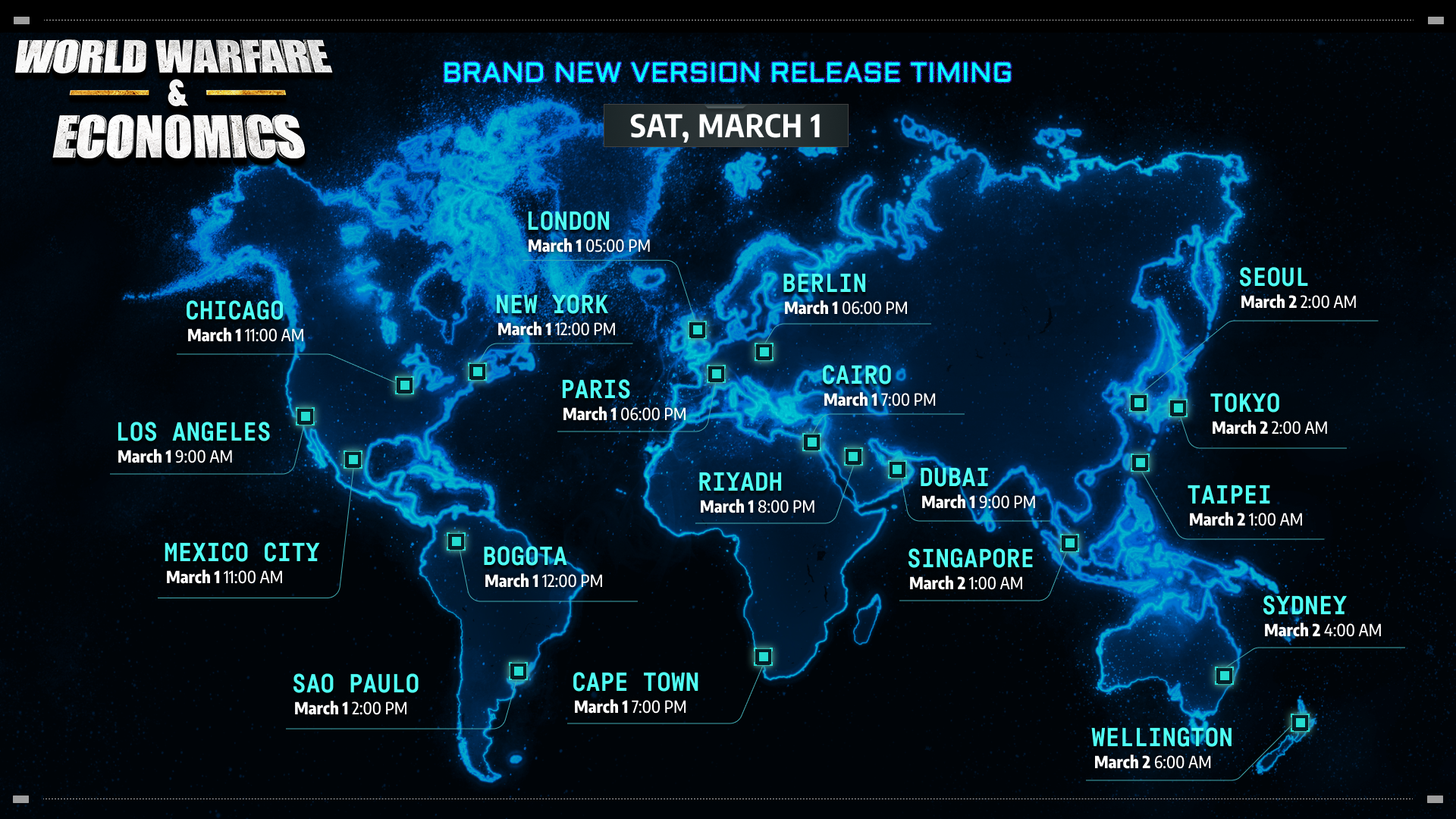 We’re thrilled to announce our Global Timing Schedule - the final update before the full global release on March 1st. For many of you who have followed our journey, you know that our December 2023 launch encountered its share of challenges, from bugs and save game issues to UX flow difficulties. For those new to our community, here’s a brief recap: our initial launch faced technical hurdles that prevented many players from enjoying the full potential of our world of warfare and economics.