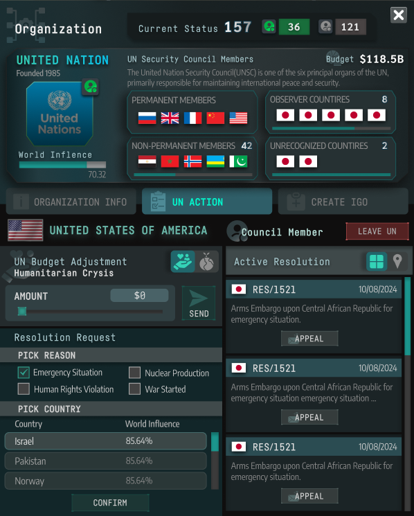 Expanded IGOs (Intergovernmental Organizations) – They’ll track country behavior, issue warnings or praise, and even kick countries that defy their objectives. Following IGO guidelines will earn influence bonuses.