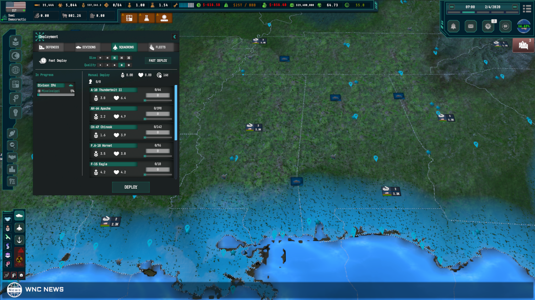 [ADD] Option to toggle all AI settings on/off (per section). [FIX] Loading now progresses past 37% when updating wages. [FIX] Fixed the crash at 67% due to an arithmetic operation overflow. [FIX] Resolved loading issues related to annexation. [FIX] Exiting the console command while focused will no longer disable keyboard input. [FIX] Various improvements to interactions with map objects and tooltips. [FIX] Fixed issue with airbase accordion not disposing correctly. [FIX] Land-based Unit UIs no longer appear empty at startup. [FIX] Enhanced air defense selection. [FIX] Minor tweaks to AI trade negotiations on behalf of players. [FIX] Incosistency with clicking on military bases when trying to deploy. [FIX] Trade deals now correctly track price changes at the time of signing, which affects GDP calculations.