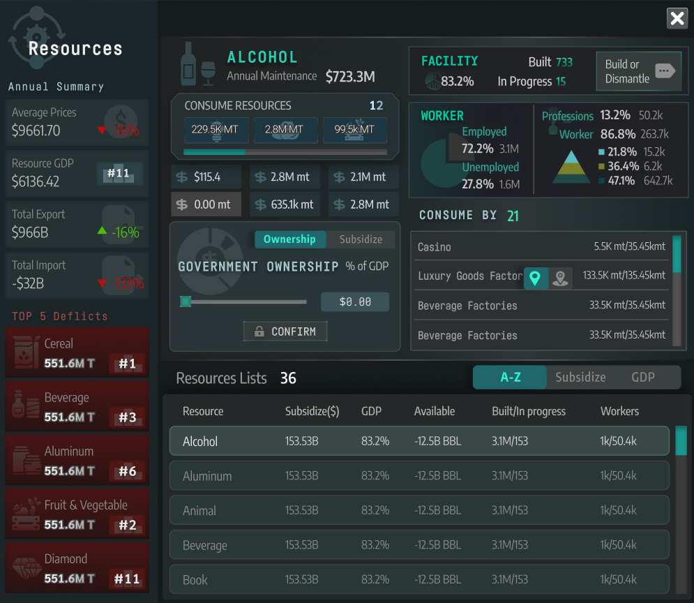 Resources management – Resource values have been simplified for easier control (while calculations remain realistic). We’ve introduced a world market where you can sell resources for quick cash.