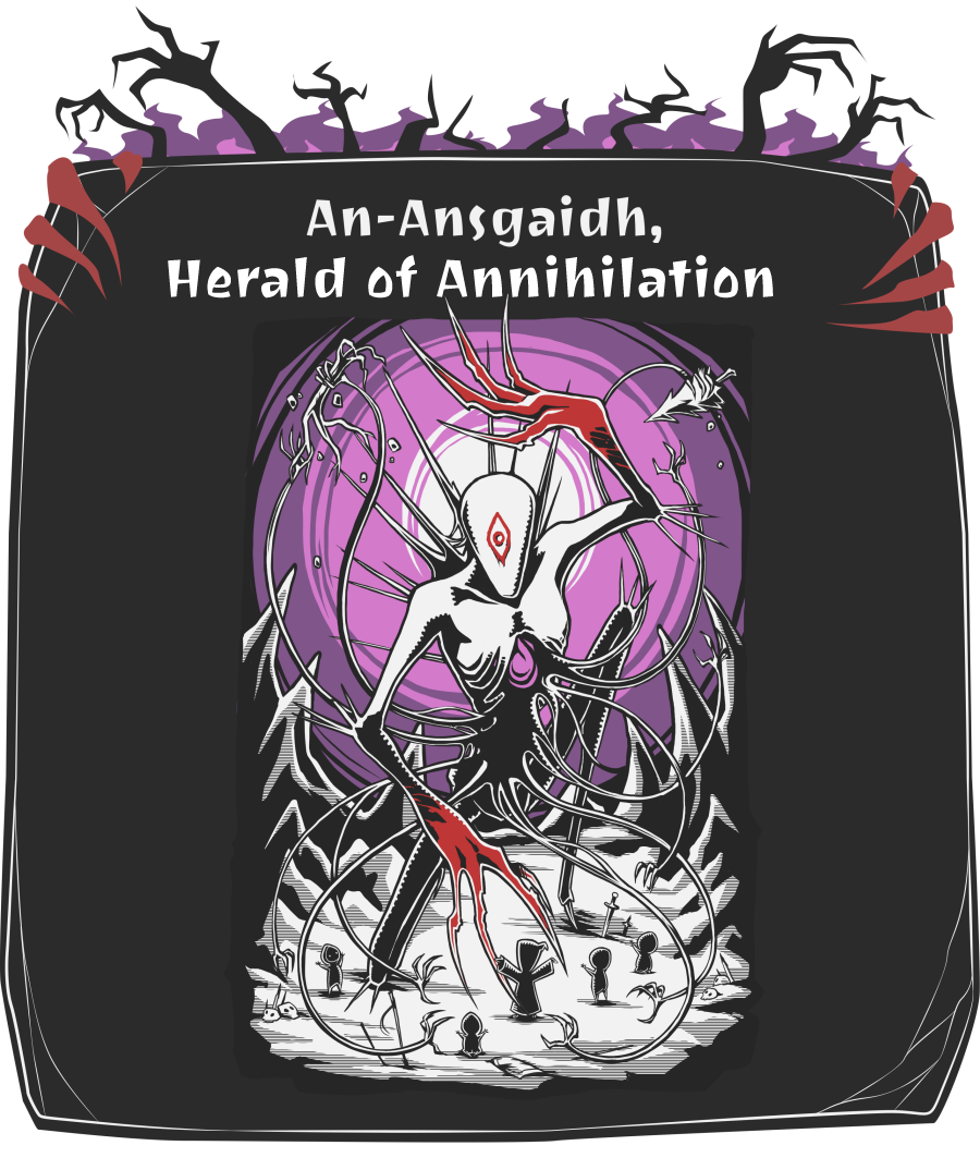 Cults devoted to the Herald of Annihilation have adopted its twisted vision. Its followers have their sights on the extinction of sentient life, and as such, they are fearsome warriors. Acts of faith for An-Ansgaidh are of the murdery kind.