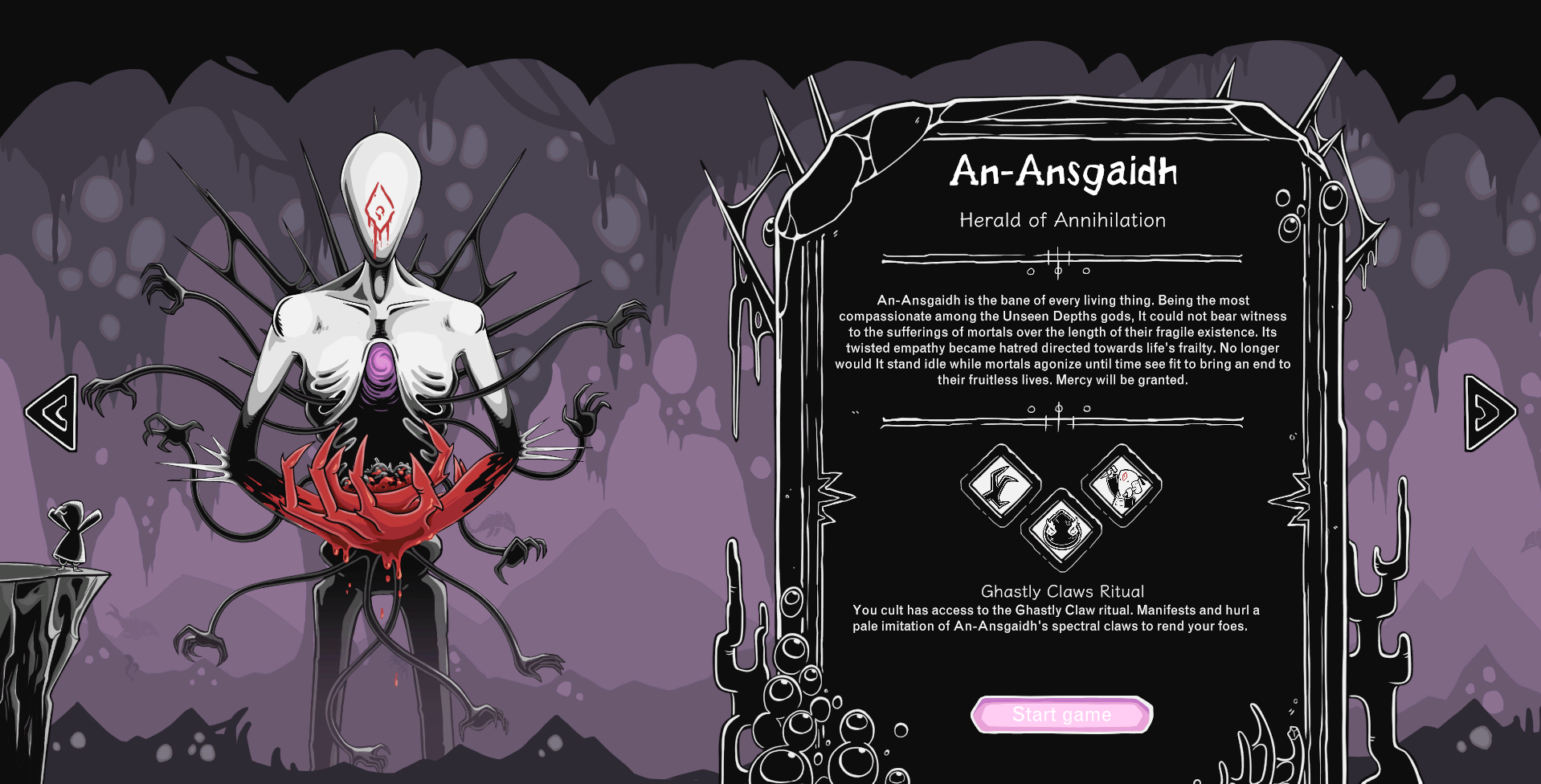 As a cultist, you will have the honor choose the Eldritch God of your choice and we made sure to have an interface well suited for the occasion. Chose wisely, because the God you chose will impact which load out you will have for your run.