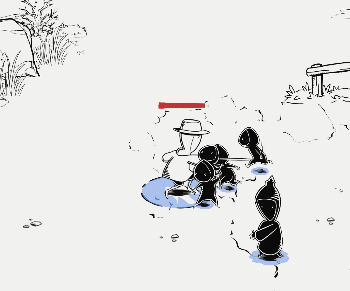 Combat is where all the action will take place. Maybe you'll have prepared your rituals beforehand or maybe you'll paint them right as the action happens. If that’s the case, your loyal mob will be here to distract your enemies while you work towards tipping the scale. You'll have a few rituals in your cultist arsenal to get rid of your opponents. No matter which one you have at hand, you will always stand a chance. As long as you can keep the blood flowing, the eldritch powers will provide you plenty of means to retaliate against your enemies. Always keep an eye on your health bar though!