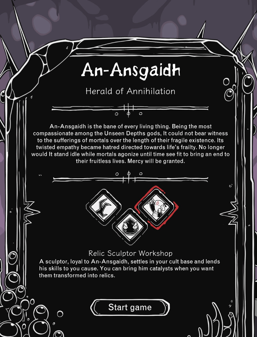 Gods are an important part of Worship’s lore and world, but they also play an even more important role in your identity as a cult leader. Today, we’ll be taking a closer look at An-Ansgaidh, the first worshippable Elder God in our demo. What could be hiding behind its featureless face? This update is covering it all. Get ready ‘cause we’re jumping right into it!