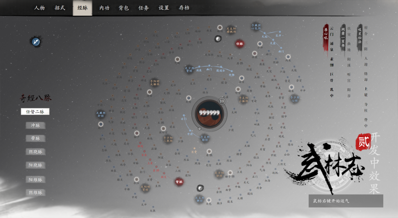 在本次版本更新中,我们新增了经脉系统,经脉系统包含任督二脉、十二正经、奇经八脉与构成它们的各个穴位,消耗在任务、战斗、修行中获得的真气便可以沿经脉顺序打通穴位,提升实力。