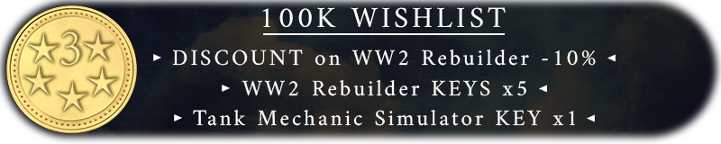 And this is what we are currently fighting for. If we reach a goal of 100 000 people wishlisting WW2 Rebuilder - we'll get a 10% launch discount on WW2 Rebuilder AND! We'll make a KEYS GIVEAWAY! We'll send out 5 free to play keys to full versions of WW2 Rebuilder and 1 key from our friends from DeGenerals to Tank Mechanic Simulator.
