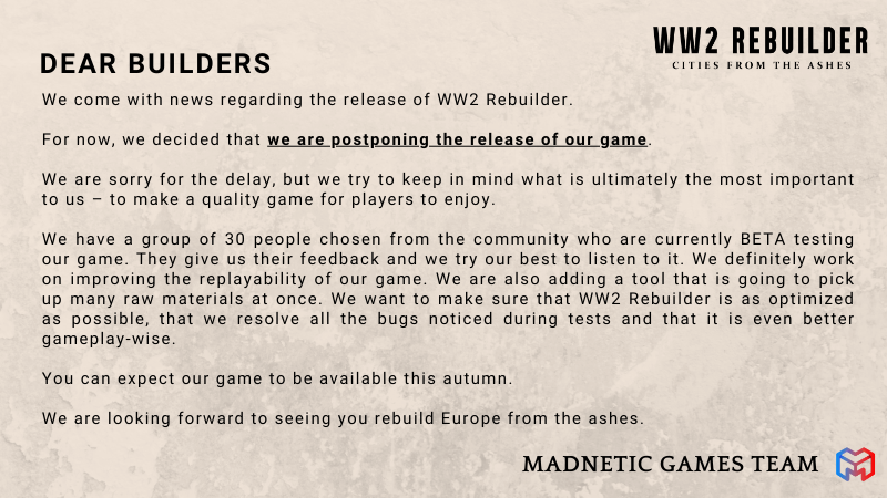 We are so excited to share our work with you very soon. We are overwhelmed by how well-received was WW2 Rebuilder: Germany Prologue. But we are taking notes of all your feedback - good and bad - and working hard on providing you the best possible experience with the full version. Thanks to you all of it is even possible.