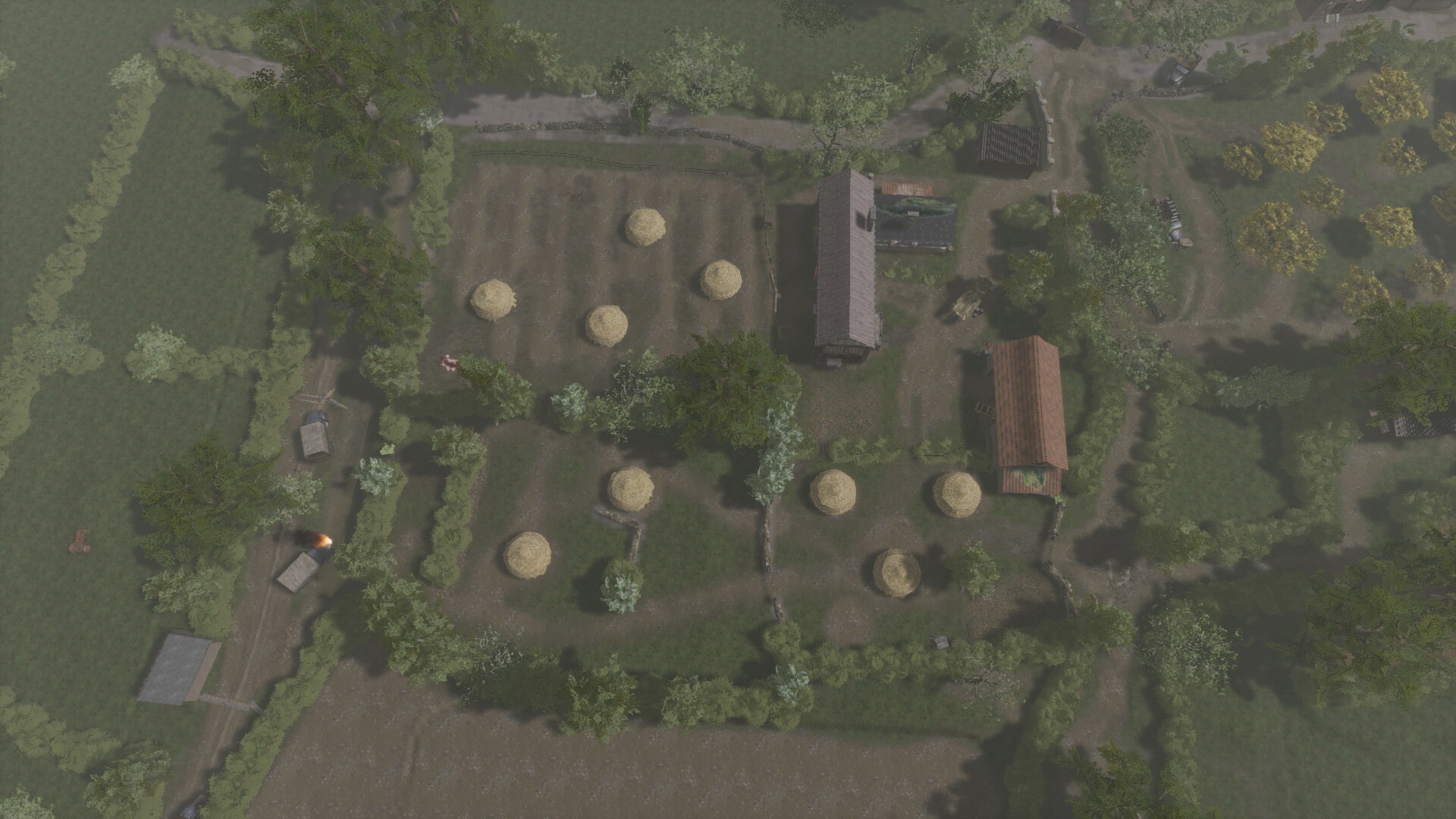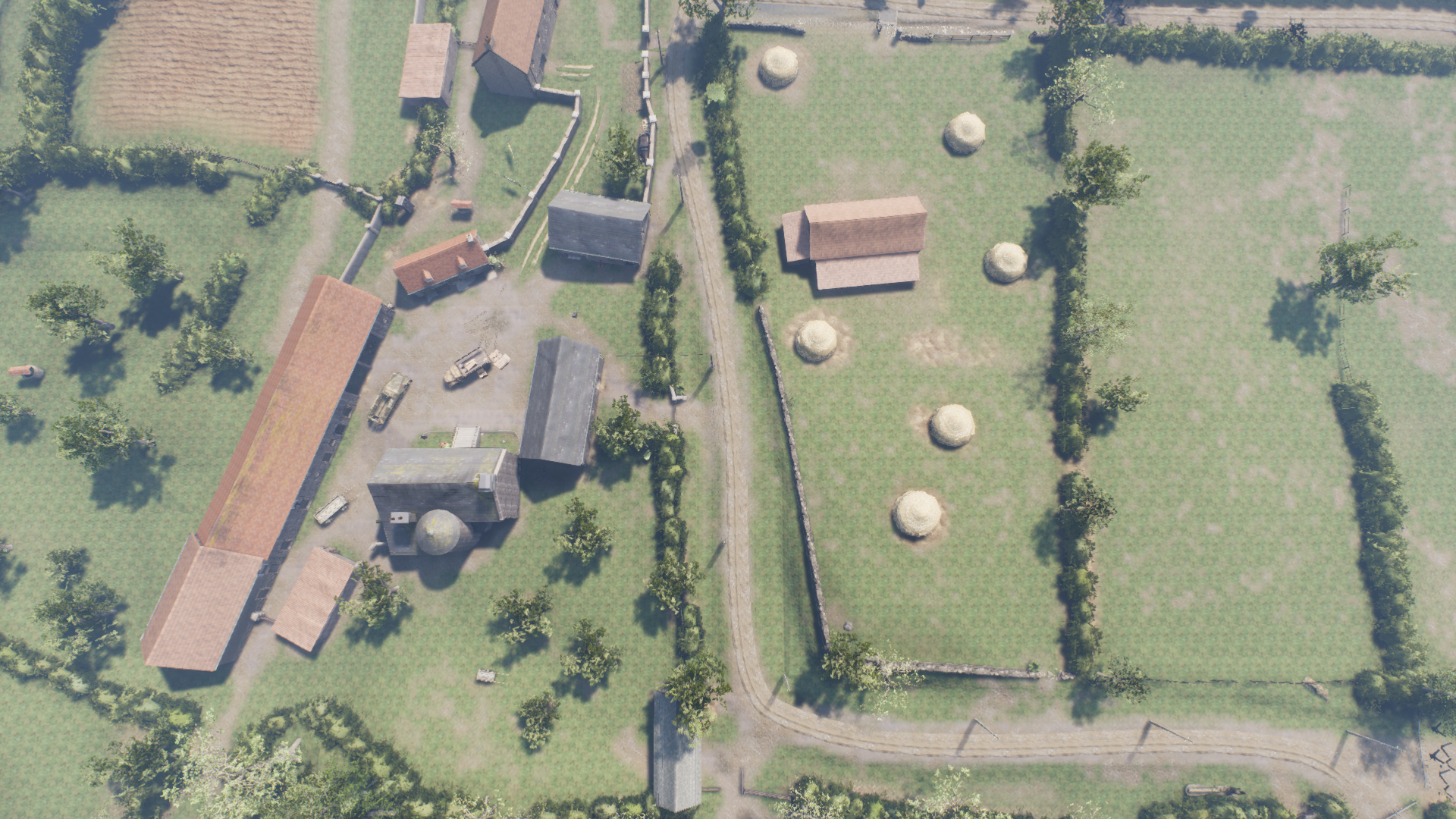 The first objective is Farm. A small farm surrounded by fields held by the germans. The allies have 3 avenues of attack. The mainroad along the north. The fields to the left of the farm, and the gully to the southeast.