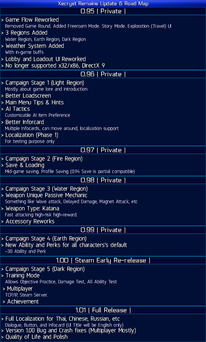 The private version (0.95-0.99) is for test purposes only, it will have content limited but will include new or crash-prone content. Save (once available) won't compatible with the release version as well.
