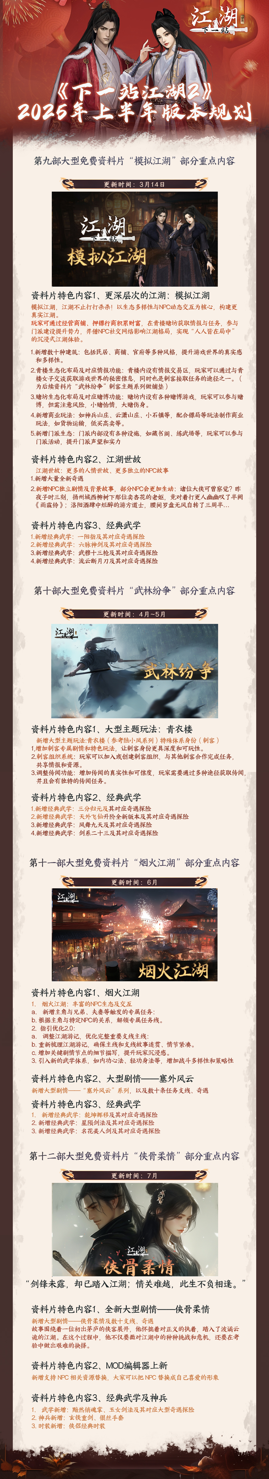 1)今年上半年的四个资料片“模拟江湖、武林纷争、烟火江湖、侠骨柔情”,将在现有游戏框架下进一步填充内容、深度优化细节体验:比如NPC生态和交互、NPC独立剧情和行为逻辑,完整的构建“会呼吸的江湖”;深度优化世界建造、门派养成与战争体验、完善市井身份体验