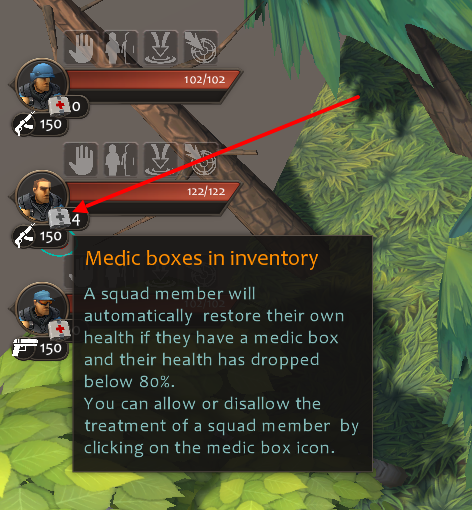 + You can allow/disallow healing for squad members, by clicking on Medic Boxes Panel