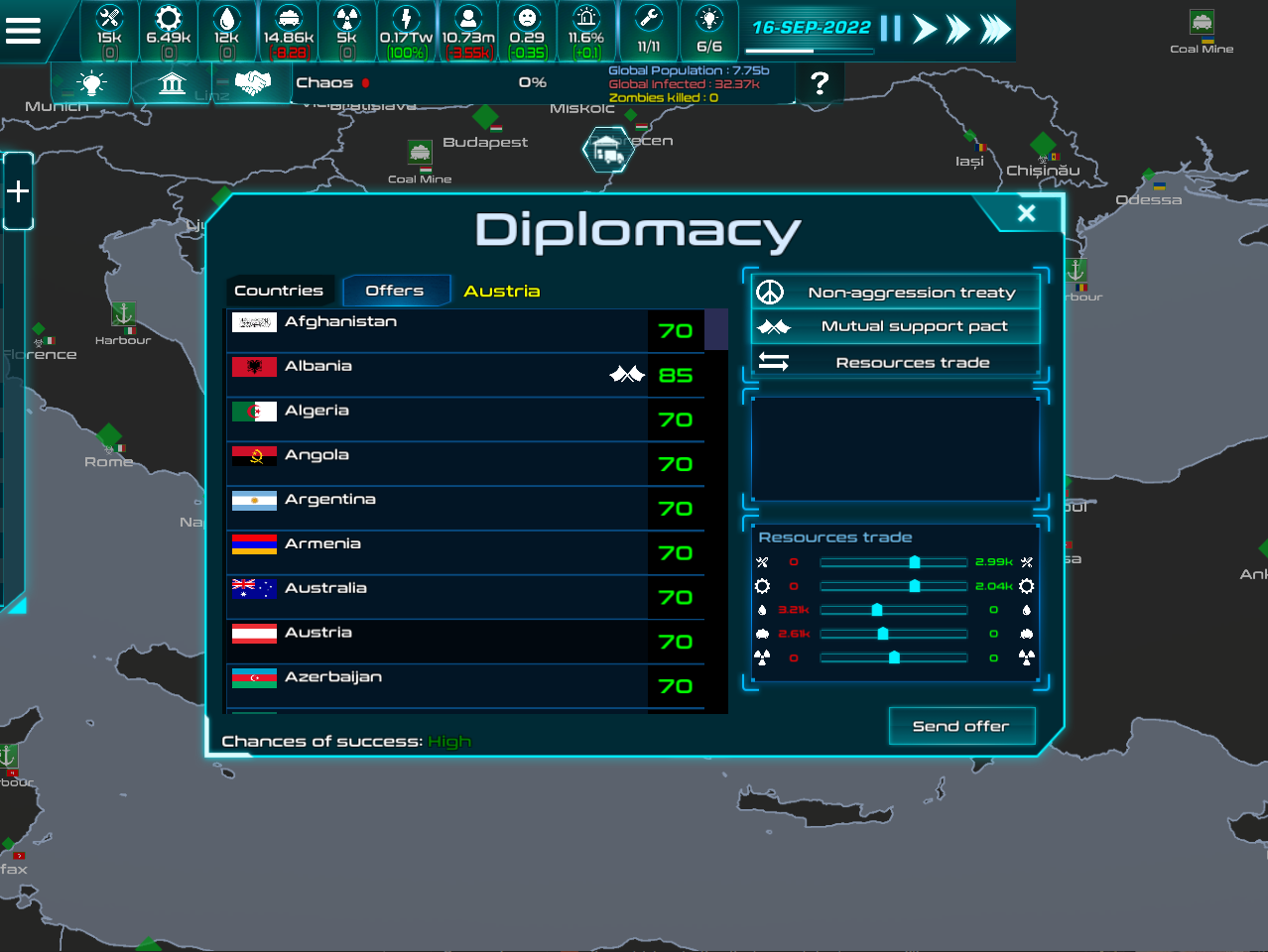 And some other changes: -The cities’ hitbox has been improved -Harbours and mines can now be abandoned -Crossing borders to help AI in a battle doesn’t reduce mutual relation anymore -Added a new game track -Fixed an issue with daily resources variation drawing -Fixed a crash when AI starts researching the vaccine -Various other small fixes