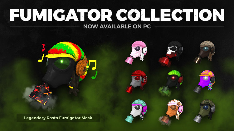 There's a new type of Crate available from the in-game Marketplace that's guaranteed to put a smile (or at least a stylish fumigator mask) on your face! The Fumigator Collection contains 10 helmets that match existing community favorite skins (such as Rasta, Anarchy, and Toxic) while providing a unique new look. This Collection has a few key similarities and important differences from standard Crates: