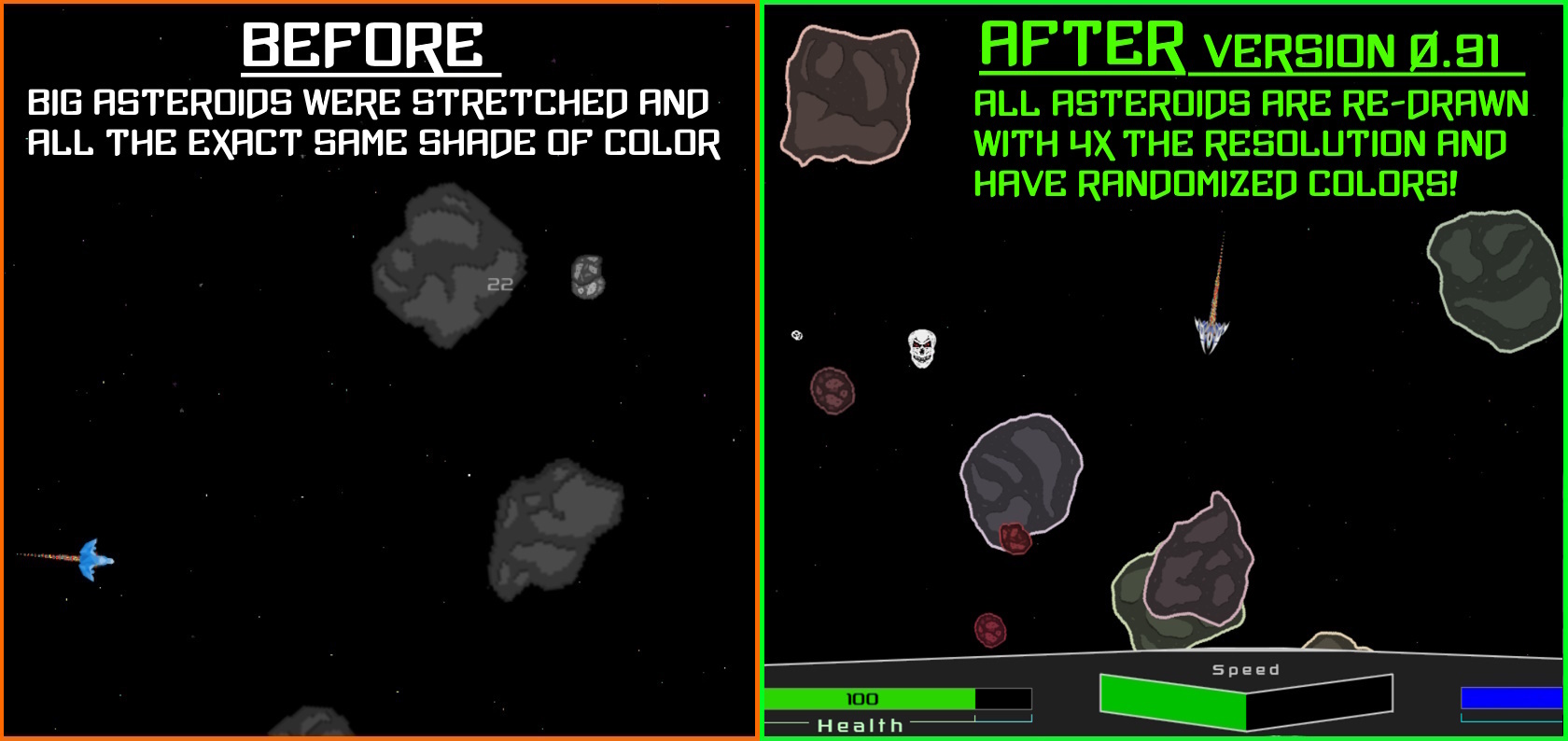 Before this update, the large asteroids were stretched by the game code to about 3x the size I originally drew them at. This was never intended to be left this way forever as I was just trying to focus on getting the game up and working during development. Now, I've finally re-drawn all of the large asteroids to make them look MUCH better and cleaner in this current build. I've also shaded both the large and small asteroids to give each one it's own individual color shade.