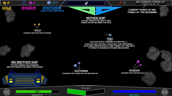- When the game starts with the introduction, a game screen is now shown to give the player important information such as what the gold, rhodium, and Zaxterion resources are, and how they are obtained. It also shows the Mother Ship and the Big Brother ship and what they sell in exchange for gold and for rhodium respectively.
