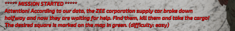 - added missions /// randomly, missions will spawn on the map where you will need to kill all the soldiers of the ZEE corporation and pick up valuable cargo, missions have three types of difficulty - light, medium and hard