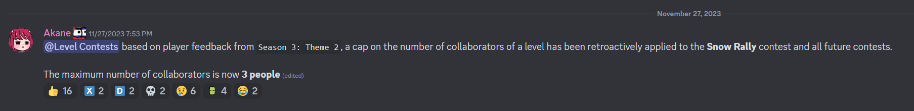 Level collaborations are permitted (Maximum of 3 players per level. This counts as a level submission for each individual creator)