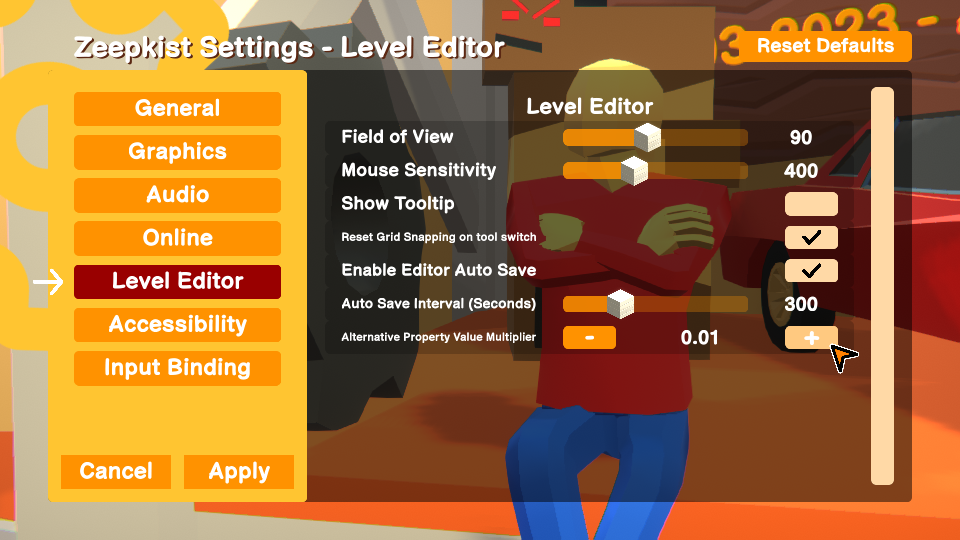 - Fixed Z-Fighting on fan block distance gizmo - Added a new setting in the Level Editor settings: "Alternative Property Value Multiplier"