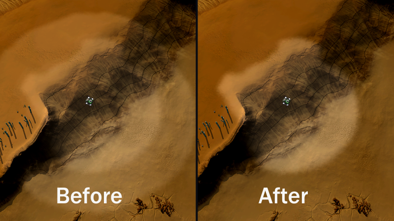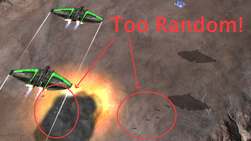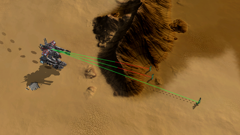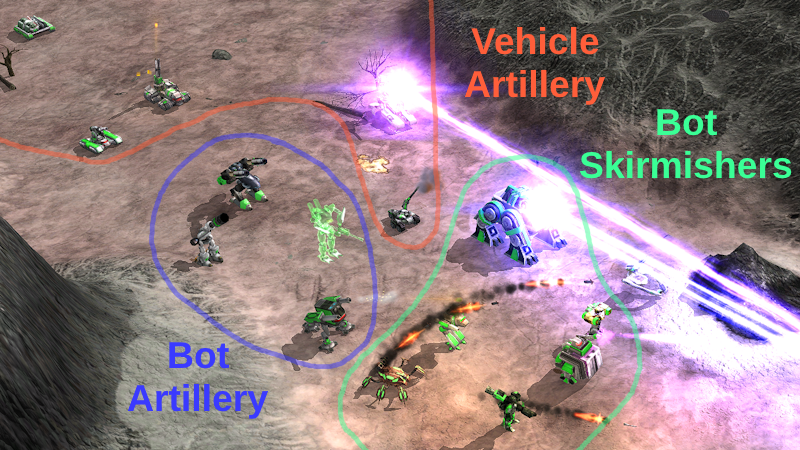 Splitting bots and vehicles by slope tolerance is an inherited choice, and it is a weird one when shorn of context. Most games have a binary approach to movement; land units can either walk somewhere, or they cannot, and with good reason. Supporting two types of traversability puts quite a few constraints on map design and balance. We are unable to make all factories viable on all maps, simply because vehicles cannot be used on sufficiently hilly maps. The point at which vehicles would become useless is earlier than you might think, since being able to move around the map efficiently is quite important. So to counterbalance this, vehicles are balanced to be a bit more powerful than bots, often via the aforementioned speed advantage, but this ends up giving them an edge on wide open maps.