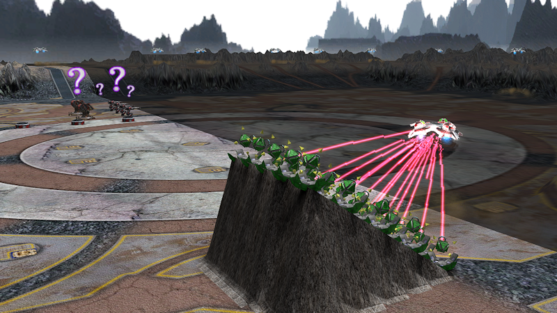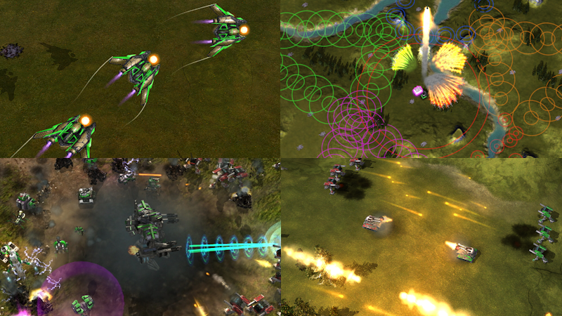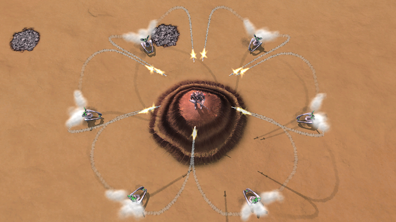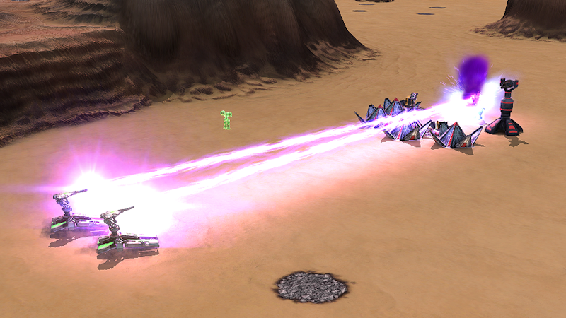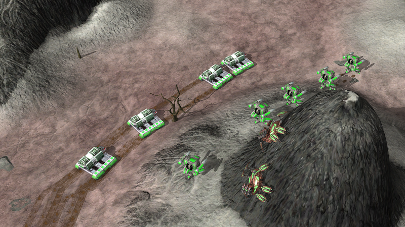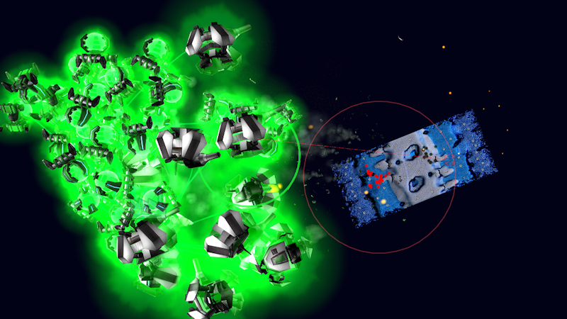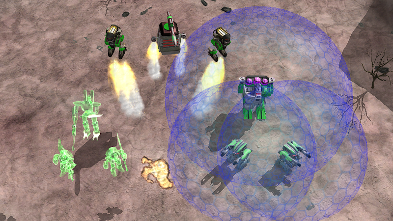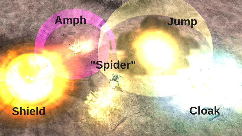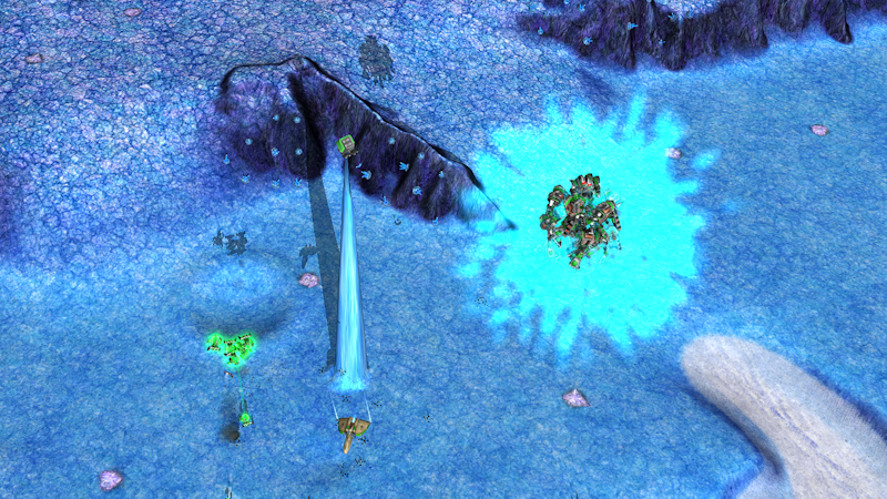 Nimble bot movement also supports the bot focus on special abilities: just imagine trying to manoeuvre cloaked vehicles through the enemy base, or to maintain an overlapping formation of shielded vehicles. These abilities also encourage players to use bots on large open maps, since vehicles are often limited to more straightforward, brute force, approaches. Vehicle armies can always benefit from the support of bots, as sometimes players need some cloaked spotters or a bit of gravity manipulation.