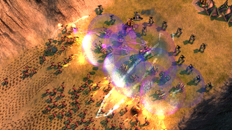 Units are also more opportunistic when it comes to fighting shields, now firing at nearby small shields if nothing else is in range. Most non-artillery do this and it is essentially a range buff against shieldballs. This behaviour, called Ward Fire, can be configured in Settings/Unit Behaviour or enabled as a state toggle under Settings/Interface/Commands.