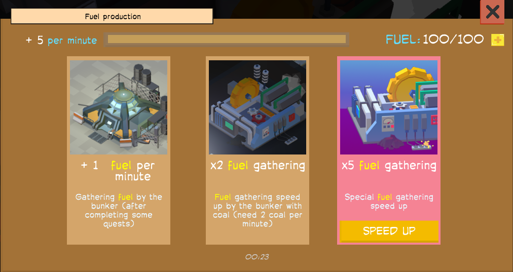 Now it produces 1 fuel per minute in real time for your convenience. You can speed up with 2 coals x2 for a minute or with 50 diamonds x5 for a week.